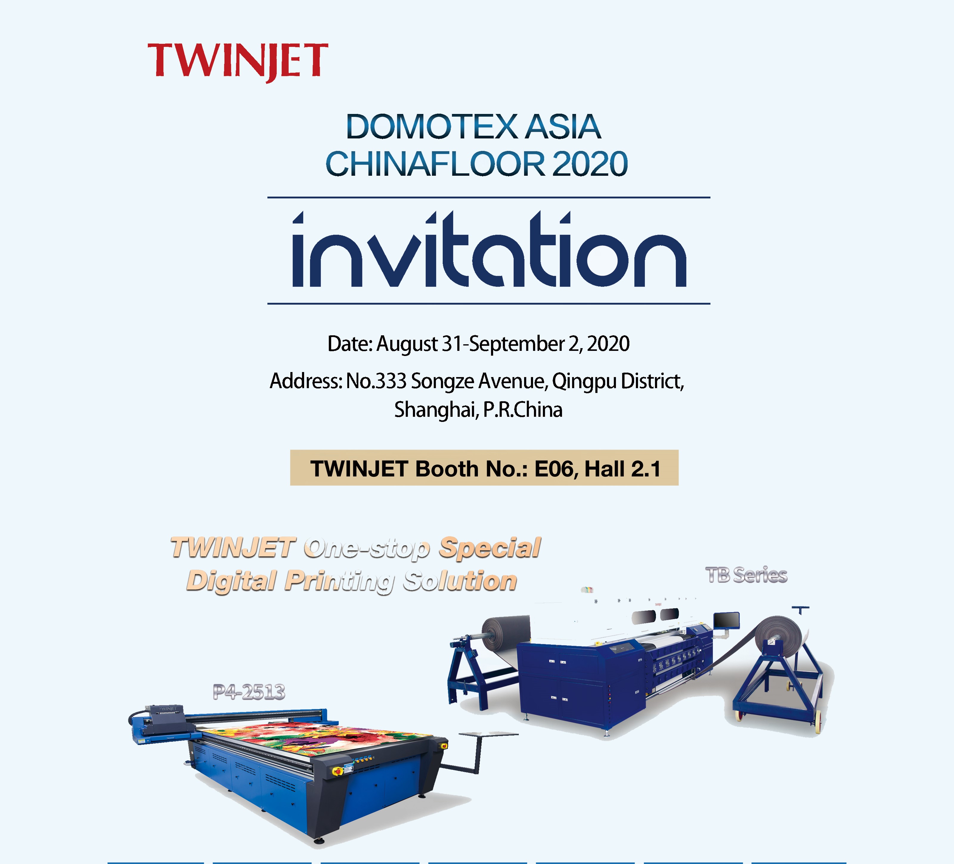 From Aug. 31 to Sept. 2, 2020, TWINJET will participate in the DOMOTEX Asia/ CHINAFLOOR held in National Exhibition and Convention Center(Shanghai). In addition to increasing product types to expanding customer choice, our company has successfully developed white ink, which is suitable for materials with dark surface, and truly become the "one-stop digital printing solution".